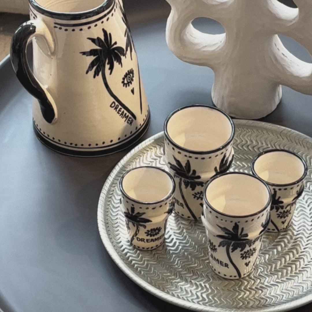 Dreamer Espresso cup Palmtree Black/Wit. Breng die moeiteloze mediterrane sfeer in huis met deze prachtige Palmtree kopjes. Zo verfijnd, zo tijdloos, perfect veelzijdig en handgeschilderd. Ze mixen & matchen prachtig met verschillende serviesstijlen. En ja, ze kunnen ook gewoon in de vaatwasser!